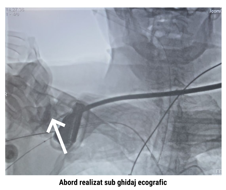 Având în vedere contraindicația pentru acces transfemural și riscul crescut al unei intervenții chirurgicale clasice, s-a decis efectuarea TAVI prin abord subclavicular drept.